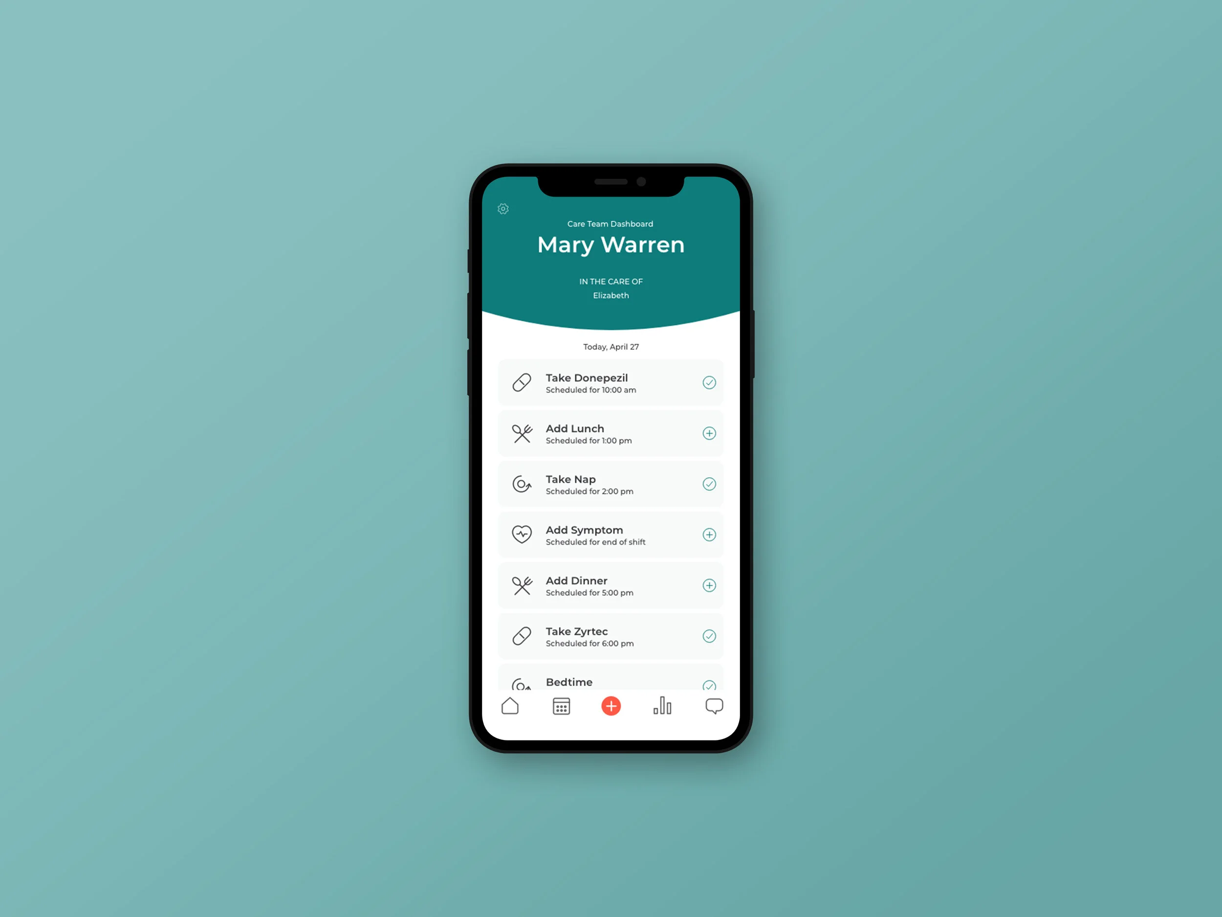 The Family Caregiver App is a mobile application for family caregivers, where all caregivers whether family, friends, or hired assistance can connect and stay updated on the well-being of a loved one. The primary objective of the application is to alleviate the pain points of the caregiving experience and enhance the quality of care. The application is meant to serve families caring for a loved one with a disorder or disease that affects cognitive function, such as Alzheimer's. Users can create a new care team or join an existing one. From any screen, users can track day-to-day health and well-being, including medications, symptoms, behavior and other cognitive, or physical functions of the care recipient. Other features include a calendar of the care recipient's schedule and caregiver shifts, health data displayed in various graphs to show changes over time, and a dated diary format to easily review activities and health status on a given day.