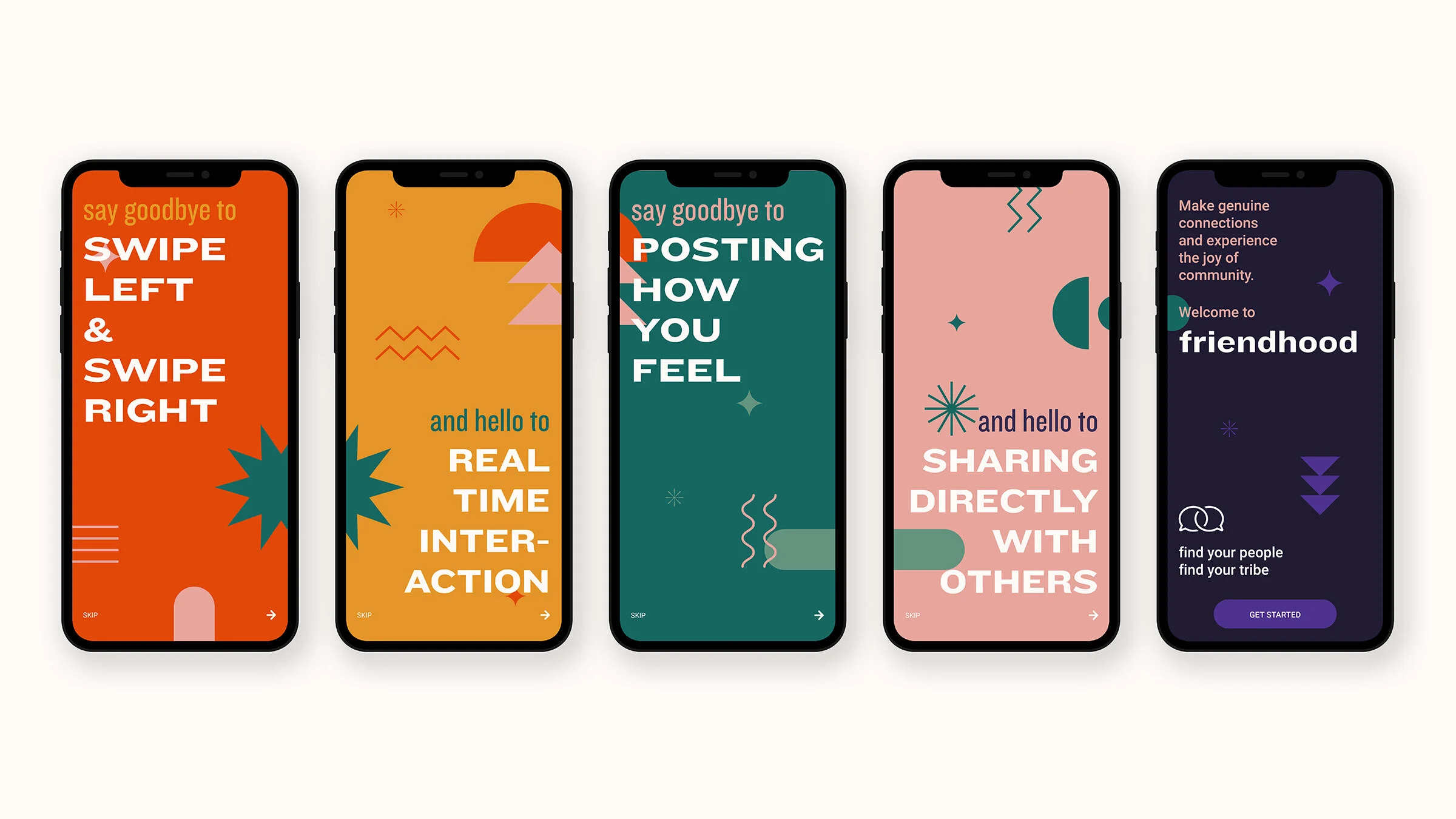 Inspired by challenges faced during the pandemic, Friendhood is a mobile application that seeks to alleviate the challenge of developing community during a time of limitation and isolation as well as improve mental health by fostering the formation of intentional, friendly support systems. Based on their profile and selection of interests, users are placed in a group or neighborhood of people with like-minded interests. The application automatically sets up the first neighborhood meet-up, which occurs within the app. The virtual meet-ups include conversational prompts and in-app games to help break the ice and encourage conversation. Users also have the ability to explore other neighborhoods and in-app events to maximize their chances of connecting and forming friendships with other people.