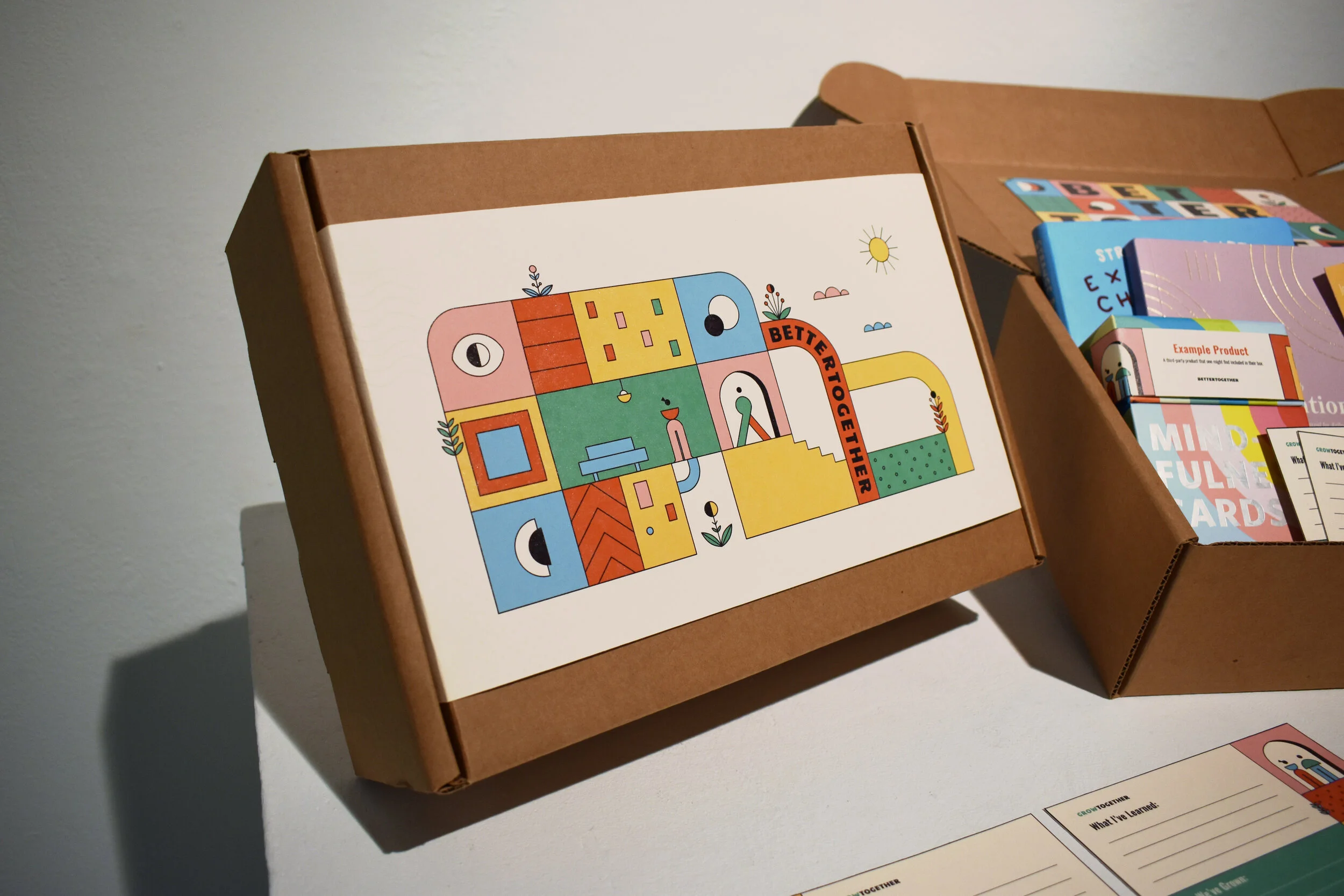 BetterTogether is a subscription box that seeks to help families grow, share, laugh, and encourage one another. While Friendhood served to connect people and help them find community, BetterTogether is focused on building up the community already established at home. The primary objective of the project is to encourage and improve communication within family units, and create opportunities for engagement and bonding. Within the box, a user will find three to four 3rd party products and a collection of branded paper goods. Four types of cards make up the collection paper goods and are designed to create a range of opportunities for families to Grow, Share, Encourage, and Remember together. The cards are named as an extension of the brand and color-coded to create an association in the mind of the user.